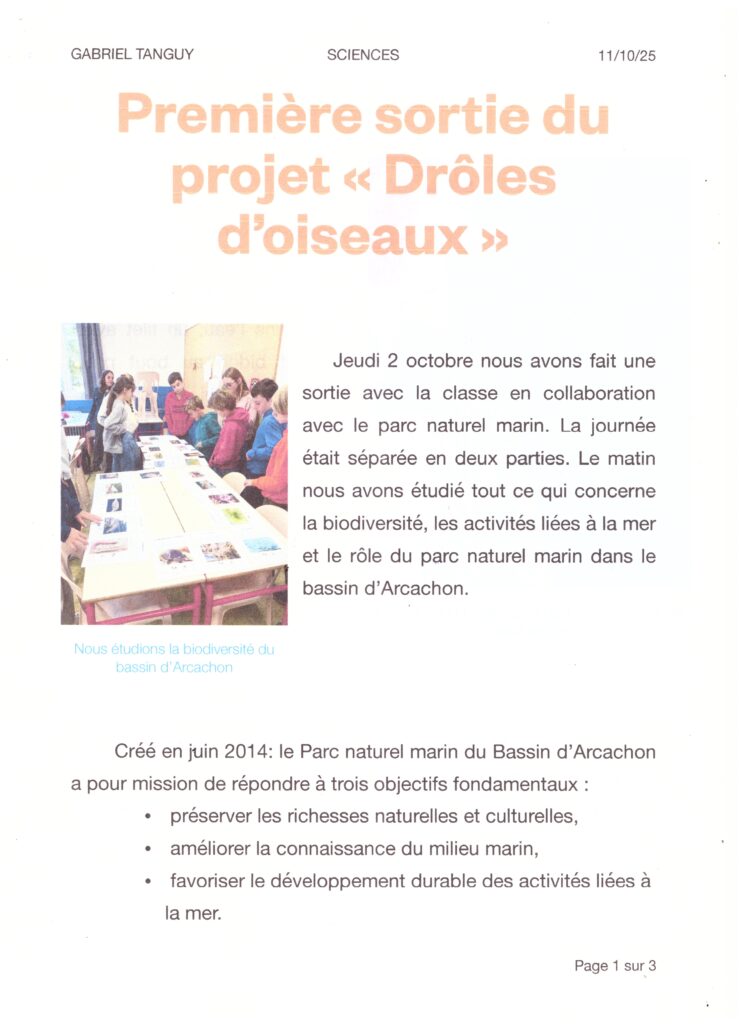 Le projet « drôle d’oiseaux » est un projet interdisciplinaire, s’inscrivant dans le parcours d’éducation Artistique et Culturelle, en partenariat avec le Parc Naturel Marin, permettant de travailler certains Objectifs du Développement Durable (ODD) en envisageant une sensibilisation à l’environnement local, sa biodiversité en particulier la découverte des oiseaux.