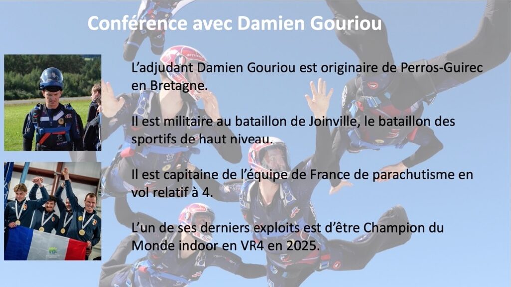 Le club FASE vous invite le 19/01 à venir écouter une conférence sur le sport de haut niveau (parachutisme). L’adjudant D. Gouriou, champion du monde, viendra parler des valeurs que le sport véhicule et qui sont très utiles dans le monde du travail.