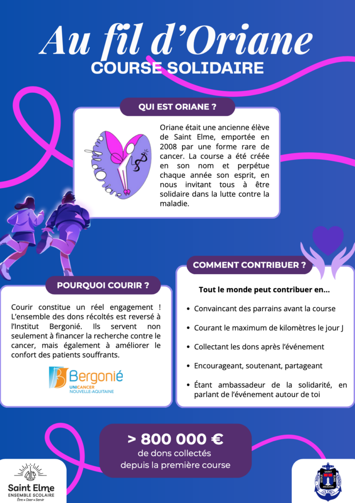 Depuis plus de dix ans maintenant, les professeurs d’EPS du collège et lycée Saint Elme organisent, avec le soutien de leurs collègues, une course de solidarité qu’ils ont baptisée « Au fil d’Oriane », en mémoire d’une élève qu’ils ont connue de la 6ème à la Terminale et qui a été emportée en février 2009 par une forme très rare de cancer.